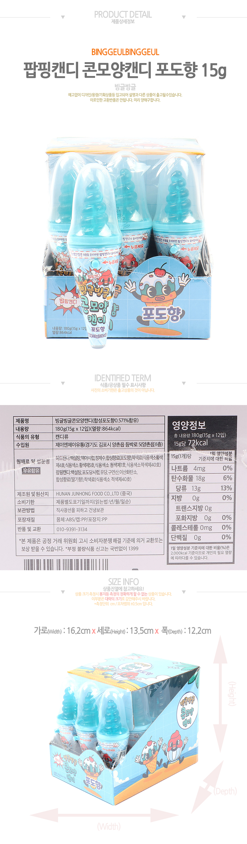 빙글빙글 콘모양팝핑캔디(포도향)(15g*12입)