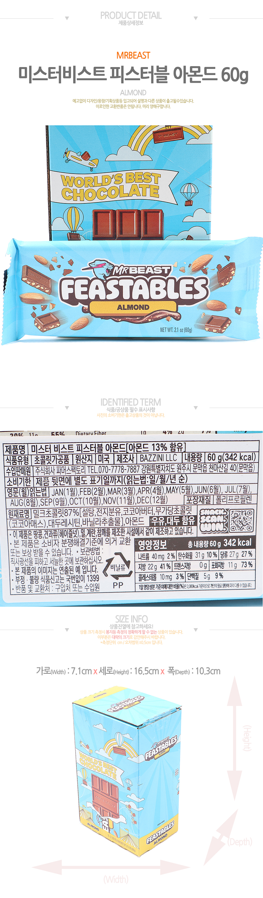 특가)미스터비스트 피스터블 아몬드초콜릿(60g*10입)